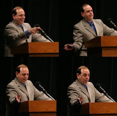 I do my homework for every show I emcee; fortunately, I've been around the game so long I already know a lot of stuff about many of the competitors. But, for example, I'll talk to each competitor prior to the contest, and get some background stuff if I don't know much about them. As far as the wit stuff goes, some people think I'm witless. The only script I follow at the IRON MAN is the order of events. But, it takes everyone working together--the expediters, the promoters, the athletes, etc to make the show run smooth
