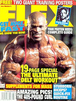 Flex Magazine considers themselves the bible of hardcore bodybuilding. Each month, Flex visits and speaks with the champions of bodybuilding at their gyms, at contests, and at their homes, gathering information and photographs, Flex brings you their latest strategies, and the competitive goals that they apply to further develop their title-winning physiques. Flex is the official magazine of the IFBB Bodybuilding Federation. On the cover is Ronnie Coleman. In the inset is Steve Reeves. |