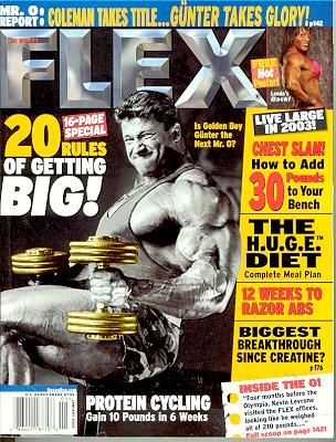 Flex Magazine considers themselves the bible of hardcore bodybuilding. Each month, Flex visits and speaks with the champions of bodybuilding at their gyms, at contests, and at their homes, gathering information and photographs, Flex brings you their latest strategies, and the competitive goals that they apply to further develop their title-winning physiques. On the cover is Gunter Schlierkamp. In the inset is Lenda Murray. | ![]() |