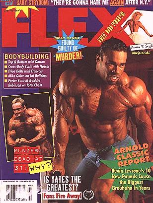 As usual, the June 1996 issue of Flex Magazine features a lot of interesting information, including how to get big in calves, delts, shoulders, and arms from three of the top bodybuilders, Dorian Yates, Nassar El Sonbaty, and Mike Francois. Other interesting articles include the Arnold Classic results, a pictorial on Marjo Krishi, and how Gary Strydom is coming back to compete after being in the WBF a long time ago.