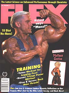The July issue of Flex Magazine features coverage of the Ironman and San Jose Pro Bodybuilding contests, both which were won by Flex Wheeler. Other interesting articles include a three step program to bring your chest up to par, and advice on bulking for delts. Lee Priest, who came in second at the Ironman Pro, is featured on the cover, while Melissa Coates is the star in the Power & Sizzle section.
