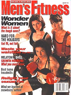 Tough Women is the special section featured in the December issue of Men's Fitness. Also, how to get fit for the holidays, and an article on some of the best ski resorts in America. The models on the covers are Lucia Rijker, Manon Rheaume, and Caroline Paul.