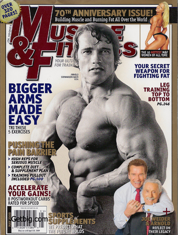 Arnold Schwarzenegger is on this month's cover, with Joe Weider in the inset. Also, Monica Brant is in the top inset. Cover issue price is $6.99 US, and $8.99 Canadian.