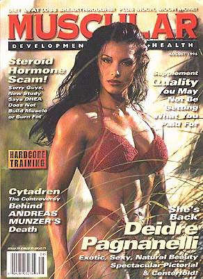 The return of Deidre Pagnanelli is one of the highlights of the August issue of Muscular Development. Also, a biased look at Twinlab's history, and how they got to be where they are now. Other interesting articles are about Andreas Munzer's death, and the controversy behind it, the sexy Carol Semple, and how a new study says DHEA does not build muscle or burn fat!