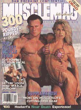 April 1996 Musclemag International issue features articles on top secret muscle foods, getting loose with Marla Duncan, Muscletech's cutting edge gear, Hoeber; s Near Death Experience, and Greg Kovacs 300 pounds ripped. On the cover of the magazine are Jason Arntz and Amy Fadhli.