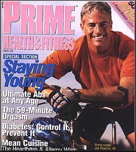 Prime Health & Fitness magazine is dedicated to the confident, active man over 35. It covers advice on all areas, including health, nutrition, mental fitness and sexuality, to graying hair, job stress, marriage, divorce and parenting. It is geared to the man who has no intentions of slowing down as he matures. The athlete on the cover is Prime reader Joe Kloenne, age 46.