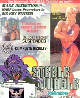 Steele Jungle Publications is a quarterly newspaper dedicated to bodybuilding, powerlifting and exercise. Our emphasis is on natural conditioning; our philosophy to enhance public knowledge and awareness on the dangerous side effects of anabolic steroids, androgens and growth hormones. On the cover is Claire Booher.