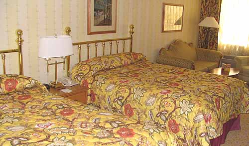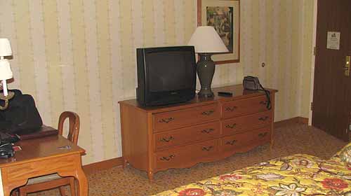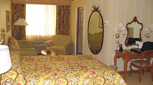 The standard room looked nice, although the flowery bedspreads just aren't my style. Still, the room had two soft chairs, a table where you can write, and of course, the television. A basic room, and clean. The hotel also has a one bedroom suite, which features a separate bedroom and living room.