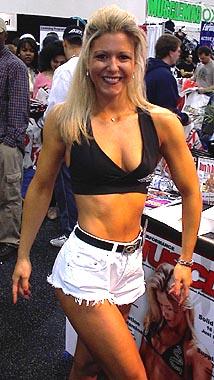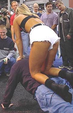 Carrie was at the AST booth having a great time, making men who can do 15 pushups with Carrie on their back get a free hat.