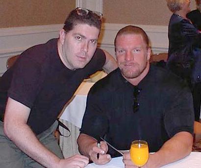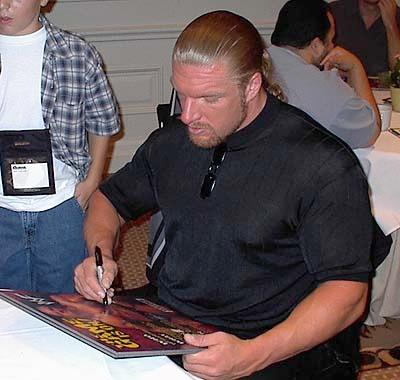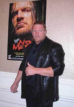 When word that Triple H, the bad boy of the WWF would come to town Saturday morning, the news spread like wildfire. Everyone wanted to meet this 6'4" man who works out regularly. Courtesy of Weider Nutrition, I was one of the fortunate ones who had breakfast with Triple H. Here he is with his poster in the background.