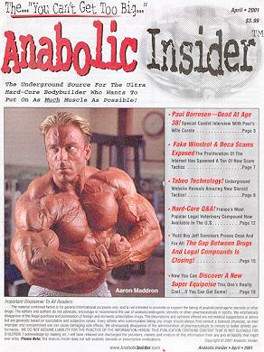 The underground source for the ultra hard-core bodybuilder who wants to put on as much muscle as possible. On the cover is Aaron Maddron.
