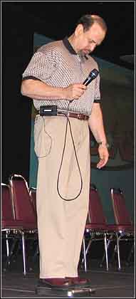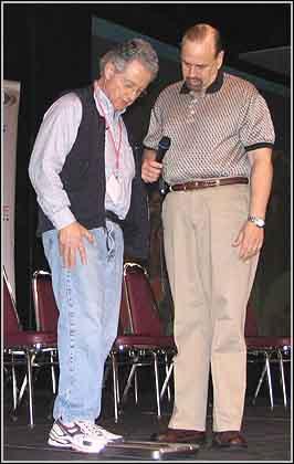 Lonnie weighs himself, the scale showing 199 pounds, 20 pounds less than he was at last year's press conference.